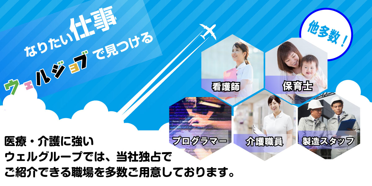 充実したサポート体制 キャリアップ支援 独自開発アプリ「楽ちんキャリアップ」や、動画を使ったeラーニングを使い、キャリアップを無料で支援! 就業先との交渉 医療介護に強いパイプを持つウェルグループだからこそ出来る、条件交渉などを担当コーディネーターが行います。 マンツーマン相談 子育てとの両立、夜勤無し、資格取得希望など、お一人お一人の希望に沿った就業先を丁寧にアドバイスします。